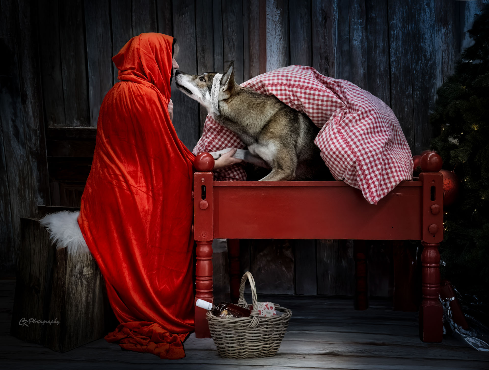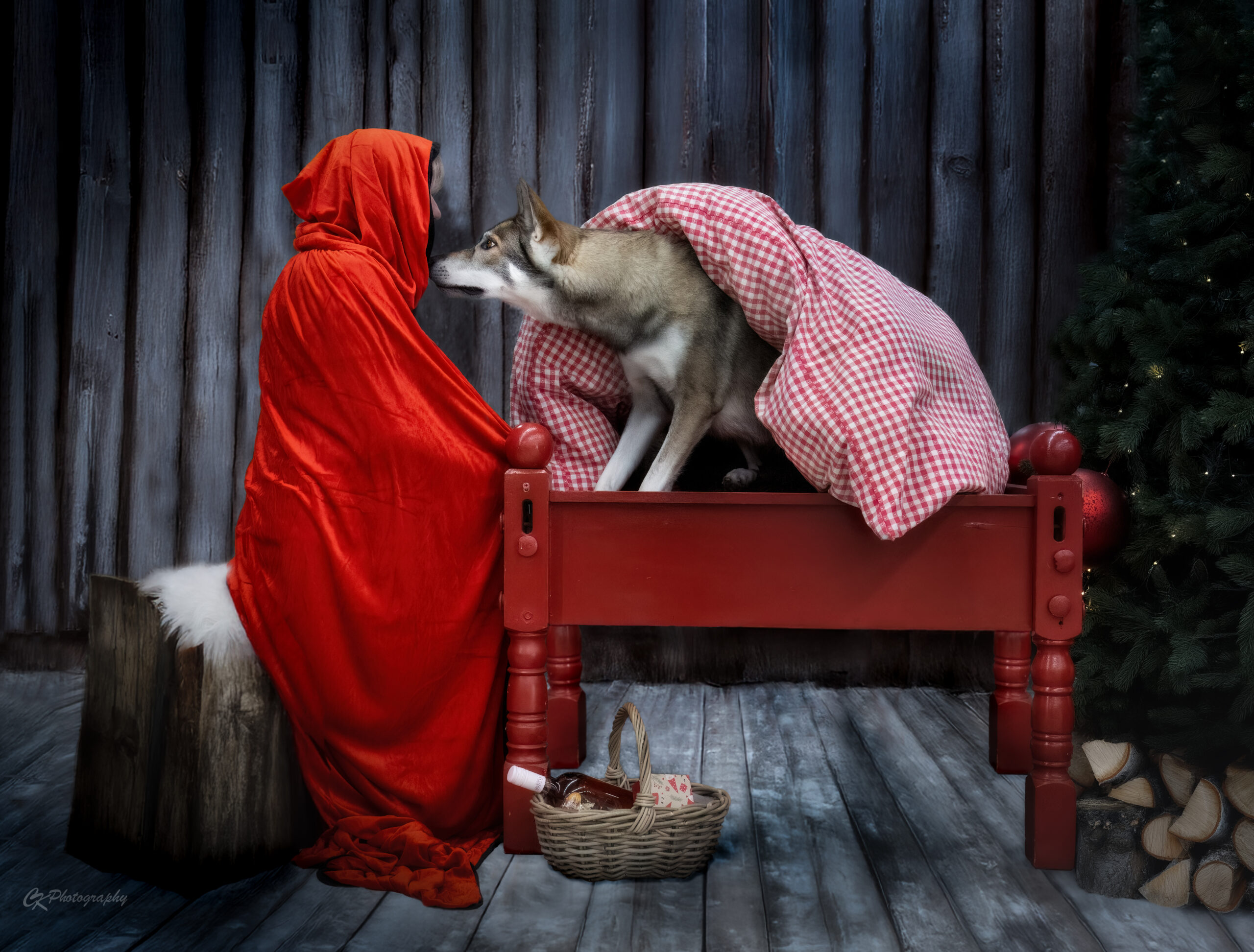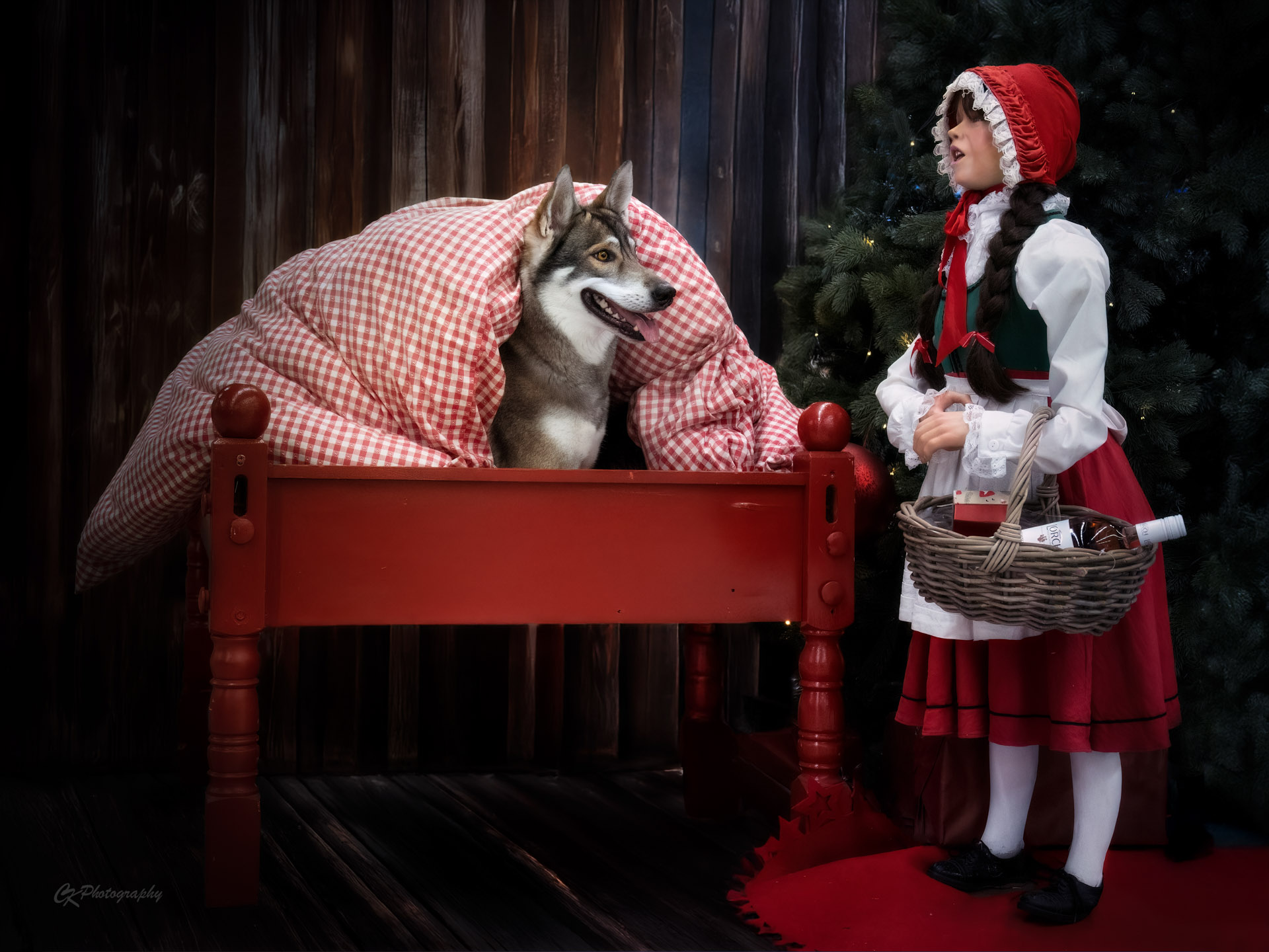 Angefangen hat das mit der Idee von der lieben Manu, mit ihrer Tamaskan-Hündin Saga doch Fotos beim Garten-Dehner in Nürnberg zu machen. Die hätten gerade so eine witzige Deko mit Rotkäppchen und dem „bösen“ Wolf… Gesagt, getan. Der Garten-Dehner war so cool, und hat uns dort die Bilder machen lassen. Saga durfte sogar den Wolf im Bett besuchen… Die ersten Bilder waren noch mit der Deko vom Dehner, aber dann hat Manu ihren Rotkäppchen-Umhang angezogen und das hat dann alles getoppt.